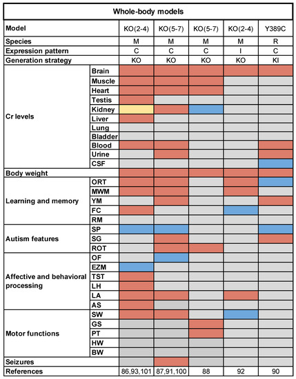 Heatmap representation of the cluster of whole-body animal models for CTD carrying different deletions/mutations of the SLC6A8 gene. Species (M: mouse; R: rat) expression patterns of a mutated allele (C: constitutive; I: inducible) and model generation strategy (KO: knock-out; KI: knock-in) were also cited. The phenotypic traits for each model are indicated (ORT: object-recognition task; MWM: Morris water maze; YM: Y maze; FC: fear conditioning; RM: radial maze; SP: social preference; SG: self-grooming; ROT: rotarod; OF: open field; EZM: elevated zero maze; TST: tail suspension test; LH: learned helplessness; LA: locomotor activity; AS: acoustic startle; SW: swimming behavior; GS: grip strength; PT: pole test; HW: hang wiring; BW: beam walk). Red squares mean significantly higher or lower performance with respect to WT animals. Blue squares refer to phenotypes with no differences between genotypes. Yellow square indicated mixed evidence. Grey squares are for not investigated tasks.