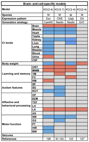 In contrast to the whole-body mutants, the endophenotype of Nes-KO animals did not include an increment of stereotyped movements and repetitive behaviors, suggesting that extraneural Cr might play a central role in the onset of autistic-like traits [125] (Figure 2). Studies of the incidence of spontaneous epilepsy and susceptibility to proconvulsant treatment are not yet available for conditional models.