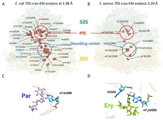Natural ribosomal RNA modifications and additional modifications implicated in antibiotic resistance mechanisms as visualized by structural analyses. (A) Cryo-EM structure at 1.98 Å of E. coli 70S ribosome (pdb file 7K00). 11 and 24 RNA modifications (red spheres) could be visualized in the 30S (16S rRNA) and 50S (23S rRNA) subunits, respectively [88]. (B) Cryo-EM structure at 3.20 Å of S. aureus 70S ribosome (pdb file 6YEF). The limited resolution allowed the visualization of 4 modifications in the 16S rRNA and 6 in 23S rRNA [89]. PTC, Peptidyl Transferase Center on the large 50S subunit. (C) Mechanism of aminoglycoside (Par, paromomycin) resistance induced by methylation of A1408 (pdb file 5ZEJ [90]). The presence of the methyl group directly perturbs antibiotic interaction. (D) Mechanism of macrolide (Ery, erythromycin) resistance induced by dimethylation of A2058 (pdb file 6XHV [91]). The two methyl groups on A2058 prevent the coordination of a water molecule with G2505, which stabilizes erythromycin binding.