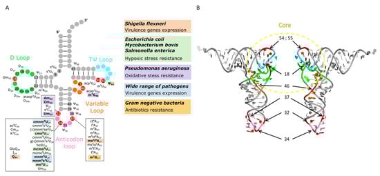 Modifications in the tRNA core are important for the stability of tRNA structure and can contribute to temperature adaptation in thermophilic as well as in psychrophilic organisms [127]. Because they are involved in the tertiary interactions maintaining the L-shape, they are also expected to influence the binding of several proteins to the tRNA (i.e., EF-Tu, aminoacyl-tRNA synthetases, and anticodon modification enzymes) [128,129,130]. Different mutagenesis studies have demonstrated the role of these modifications in tRNA structure stabilization and their consequences on bacterial physiology during stress adaptation and on pathophysiology.
