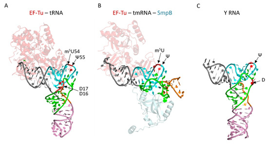 The structures of tmRNA and Y RNA mimic part of the tRNA structure. (A) The structure of EF-Tu-tRNAPhe complex (with GDPNP, GTP analog) from Thermus aquaticus (pdb file 1TTT [189]). Each domain of the tRNA is colored: acceptor am in grey, TY-arm in light blue, the variable region in orange, the D-arm in green, and the anticodon-arm in pink. EF-Tu structure is represented in light pink. (B) The structure of the tmRNA fragment in complex with EF-Tu (with GDP and kirromycin antibiotic, in light pink) and SmpB (in light grey) from Thermus thermophilus (pdb file 4V8Q [190]). The regions of tmRNA mimicking tRNA are shown with the same color code as for the tRNA. (C) Salmonella Typhimurium Y RNA (YrlA, pdb file 6CU1 [191]). The regions of YrlA mimicking tRNA are shown with the same color code as for the tRNA.