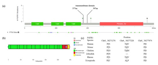 Mapping and conservation analysis of four variants: (a) Mapping of four FGFR1 variants revealed that c.2334dupC and c.2339T>C are located in the intracellular region and post-translational phosphorylation sites of the FGFR1 protein, whereas c.1261A>G is located in the transmembrane region and close to the post-translational phosphorylation site; (b) The result of NMD prediction of c.2334dupC showed that it is located in the NMD-incompetent region; (c) Mutation loci of the three missense variants (c.2339T>C, c.1261A>G and c.1107G>A) are highly conservative across different species.