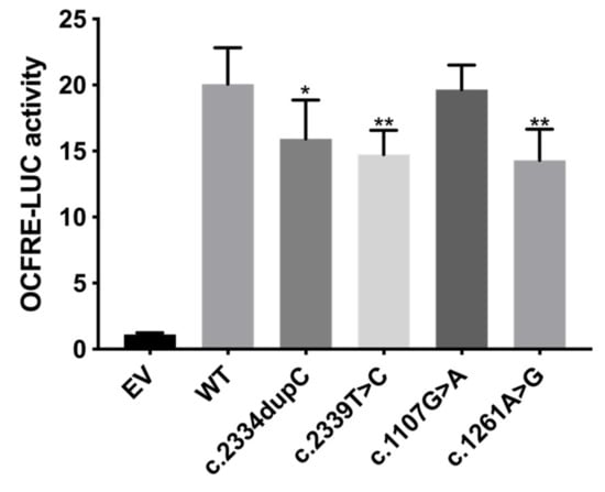 As for the three missense variants, all of them were predicted to be deleterious by MutationTaster, LRT and CADD, but had different predictions by SIFT and Polyphen2. Two missense variants (c.2339T>C and c.1261A>G) were highly conservative across a wide range of vertebral species, suggesting them to be deleterious variants. Functional studies revealed that all missense variants had reduced overall protein expression, but only the decrease in c.2339T>C was statistically significant (Figure 3). Further luciferase assay indicated significantly reduced luciferase reporter activities (c.2339T>C and c.1261A>G), and thus, had diminished signaling functions (Figure 4). As the OCFRE reporter used in luciferase assays reports the activity of the MAPK pathway downstream of FRS2α signaling, we can conclude that c.2334dupC, c.2339T>C and c.1261A>G diminish the MAPK pathway.