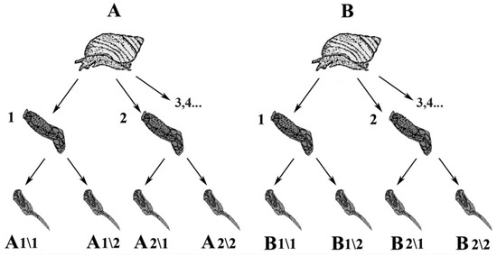 Nomenclature of clones selected for SAFLP [31]. A single miracidium infects the first intermediate host (A,B) and produces parthenogenetic generations of rediae (A1…; B1…). They reproduce themselves to maintain the population and then produce free-living larvae—cercariae (A1/1, A1/2, A2/1, B1/1, B1/2, etc.). This nomenclature is used in Figure S2.