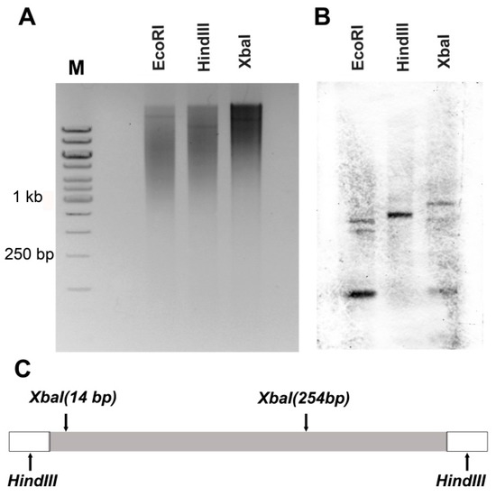 We used the restriction enzymes HindIII, EcoRI, and XbaI (SibEnzyme, Russia) to digest fluke DNA at 37 °C for 12 h. Restriction enzyme EcoRI does not have sites inside CR1-rng sequence, there are 2 sites for XbaI, and HindIII sites are situated at flanking sequences (Figure 2C). The restriction fragments were separated by 0.8% agarose gel electrophoresis. The DNA was transferred to Hybond N+ (Amersham, UK). CR-RT and CR1-rng fragments were labelled with biotin-11-dUTP (DNA-synthesis, Russia) by PCR, with a HindIII + cag primer (Table 2). The hybridisation occurred at 56 °C overnight, according to the standard protocol [52]. Signals were detected with streptavidin–horseradish peroxidase conjugate (Sigma, Burlington, MA, USA, dilution 1:4000) and 3,3′-diaminobenzidine, according to the manufacturer’s protocol [53].