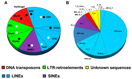 The cloned fragments were subjected to similarity searches against the GenBank, European Nucleotide Archive, and WormBase ParaSite databases, and BLAST was performed with the assembled transcriptome and mobilome contigs of flukes. Previously sequenced fragments obtained from conserved bands after AFLP pre-amplification [31] were added to the analysis (Figure 3, non-LTR, fragments CR1-B1-B3, CR1-A1, RTE-A2, Table S1, column 1, NO. 28–31 and NO. 35). RepeatMasker was used to detect TE sequences. All sequence annotations are summarised in Table S1 and are available in GenBank (accession numbers MK287490–MK287525). Different TE coding and noncoding parts accounted for 21 out of 36 sequenced fragments. All sequences were analysed using a SINE Base search [45], and SINE-like elements were detected in several fragments (Figure 4A; Table S1). The description of the SINEs requires additional evaluation due to their high species specificity. No TRs were found among the cloned fragments with a TRF (see Materials and Methods), nor were cloned fragments found among TRs identified with RepeatModeler and RepeatExplorer2.