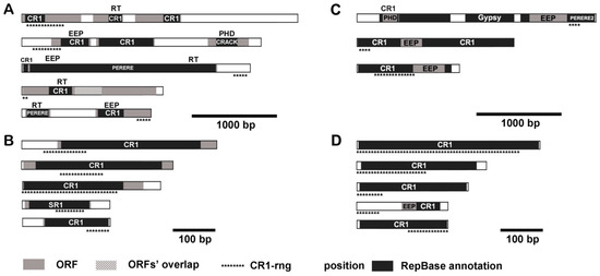 CR1-rng-containing transcripts (A,B) and mobilome contigs (C,D). Open reading frames (ORFs, grey boxes), Repbase-annotated fragments (black boxes), and transposon names are shown. Predicted conserved domains: RT—reverse transcriptase; EEP—exonuclease/endonuclease/phosphatase; PHD—plant homeodomain. Asterisks indicate the position of the match with CR1-rng. Transcripts that do not contain any conserved domains are not shown.