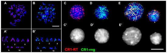 Signal dispersion throughout chromosome arms is typical for LINE-like TEs (Figure 6A) and is in agreement with published data [64]. The RT probe produced the most numerous signals on chromosomes 1–5 and 9 (Figure 6A’). On the contrary, CR1-rng signals mostly localised to the subtelomeric regions of all chromosomes, with several signals near centromeres, while signals along the chromosome arms were scarce (Figure 6B,B’).