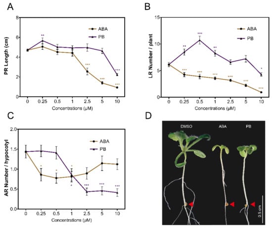 To investigate the control of ABA over root development, a series of in vitro experiments were set up to test for primary root growth, lateral root and hypocotyl adventitious root formation (Figure S1). Since ABA has a wide spectrum of activities when exogenously applied, the more selective, synthetic ABA analog pyrabactin was used for comparison [35]. ABA control over root growth is complex as it can both stimulate growth of the primary root and inhibit growth of lateral roots under salt stress conditions by signaling within the endodermal layer [47]. Consistent with the inhibition of primary root growth and cell expansion by exogenous ABA [48], primary root growth, adventitious root (AR) and lateral root (LR) formation were strongly inhibited in a dose-dependent manner (Figure 1). ABA impaired primary root growth at 2.5 µM and above, while at least 10 µM PB was required to show a significant reduction in root length (Figure 1A). At the lowest PB dose (0.25 µM), primary root growth was significantly stimulated, in line with the earlier reports showing that ABA can stimulate growth of the primary root by signaling within the endodermal layer [41,49]. In contrast to the primary root, ABA and PB differentially regulated lateral and adventitious root formation (Figure 1). ABA inhibited LR formation at every concentration applied, whereas PB showed a biphasic dose dependence. Low doses of PB stimulated LR formation and, at 10 µM, the number of LR formed was reduced (Figure 1B). In our assay, etiolated seedlings are transferred to light conditions, stimulating AR formation to, on average, 1.4 AR per seedling (Figure 1C). ABA inhibited AR rooting, which is consistent with the reduction in AR formation in deepwater rice [50] and wheat grown under waterlogged conditions [51]. However, ABA and PB treatments produced a different dose–response curve: low doses of ABA inhibited AR formation more strongly than higher doses (Figure 1C), while PB was a more potent inhibitor, specifically at the higher doses (Figure 1C). The differential responses of three root structures analyzed reveal a complex regulation of root growth and architecture by ABA. Furthermore, it suggests that synthetic analogs of ABA, such as pyrabactin and derivatives, may be used to modulate root architecture to improve, for example, drought tolerance.