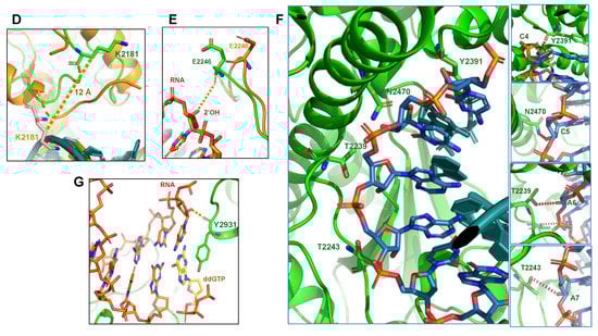 To probe the mechanism by which Polθ-pol uniquely accommodates DNA/RNA hybrids, we utilized X-ray crystallography to solve the ternary structure of Polθ-pol on a DNA/RNA primer-template with incoming 2′,3′-dideoxyguanosine triphosphate (ddGTP). Remarkably, the 3.2 Å structure of the Polθ-pol:DNA/RNA:ddGTP complex revealed that the thumb domain undergoes a major structural rearrangement to accommodate the DNA/RNA hybrid when compared to the previously solved structures of Polθ-pol binding to a DNA/DNA primer-template (Figure 6A–C) [26]. For example, 57% of residues within this subdomain, which interacts with the hybrid double-helix region five base-pairs upstream from the 3′ primer terminus, undergo conformational changes from helices to loops (Figure 6B). This partial refolding of the thumb domain may be needed to provide the necessary interactions with the DNA/RNA hybrid that is wider than B-form DNA/DNA and takes a slightly different orientation in its interaction with the polymerase (Figure 6B). The 12 Å shift observed for residue K2181 highlights the dramatic reconfiguration of the thumb subdomain (Figure 6D). In contrast to the two previously solved structures of Polθ-pol:DNA/DNA:ddGTP complexes, which were in the closed configuration, our Polθ-pol:DNA/RNA:ddGTP complex was captured in the open configuration. Thus, the O-helix in the fingers subdomain is rotated outward, and the incoming ddGTP substrate is partially solvent-exposed (Figure 6C). The open to closed conformational change upon dNTP binding by A-family Pols on DNA/DNA has been extensively characterized by many laboratories and continues to provide intriguing mechanistic insight into these highly conserved enzymes [65,66,67,68,69]. Another notable shift observed in the Polθ-pol:DNA/RNA:ddGTP complex includes residue E2246 (palm subdomain), which appears to form a specific ribose 2′-hydroxyl interaction with the RNA template (Figure 6E). Additional multiple hydrogen bonds are observed between the 2′-hydroxyl group of the RNA template and Thr/Gln residues of Polθ-pol (Figure 6F). Polθ residue Y2391 also forms a hydrogen bond with the template ribonucleotide that pairs with the incoming ddGTP (Figure 6G). Similar hydrogen bonds are observed in structures of retroviral RTs, indicating a similar binding mechanism on RNA [70,71]. Overall, the major conformational changes observed by Polθ-pol on the DNA/RNA relative to prior structures of the enzyme captured on DNA/DNA are unprecedented and reveal that Polθ-pol possesses extraordinary plasticity, which likely explains its unusual promiscuity relative to other Pols.