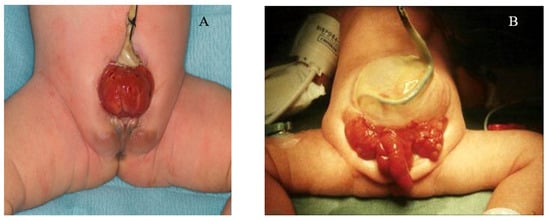 CE is a major birth defect in which the bladder is widely open on the infraumbilical abdominal wall and is separated into two distinct halves. It is often associated with omphalocele, separated pubic bones, short-gut syndrome, and other malformations, including talipes and spina bifida (Figure 1B) [,]. Typically, a foreshortened hindgut or cecum ends between two exstrophied hemi-bladders and the orifice of the terminal ileum is located at the everted cecum []. In males, the phallus is small and bifid with a hemi-glans caudal to each hemi-bladder [,]. In females, the uterus is generally bicornuate, with varying degrees of Müllerian duplication, two hemi-vaginas, and a bifid clitoris [,].