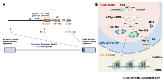 UBF-bound NORs are associated with rDNA hypomethylation, acetylated histones and transcriptionally permissive or active rDNA features. In contrast, NORs unbound to UBF are associated with heterochromatic histone modifications, CpG hypermethylation at promoter regions and transcriptionally inactive rDNA [17,18,19,20]. The active rDNA repeats are transcribed by Pol I to produce the 47S pre-rRNA, which is processed to form the mature 18S, 5.8S and 28S rRNAs. These rRNAs then assemble with 5S rRNA transcribed by Pol III and ribosomal proteins (RPs) to generate the 40S and 60S subunits in the nucleolus, before being exported into the cytoplasm to form functional ribosomes (Figure 1B).