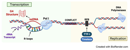 Several unique characteristics of the rDNA repeats, including their repetitive nature, high Pol I transcription rates and high GC content, present risks of genomic instability at the rDNA loci [31]. The head-to-tail arrangement of rDNA copies on the five human acrocentric chromosomes allows intrachromosomal recombination between distant repeats on the same chromosome and interchromosomal recombination between repeats on different chromosomes at proximity within a nucleolus. Thus, dysregulations in rDNA copy number and genomic rearrangements are likely to occur [30,32]. Furthermore, high levels of transcription render the rDNA clusters vulnerable to transcription-replication conflicts. A head-on collision between the Pol transcription machinery and DNA replication forks triggers local accumulation of positive DNA supercoiling (Figure 2). This increases torsional stress and replication fork stalling within the rDNA region, thereby impinging upon both transcription and replication processes [33]. In addition, negative DNA supercoiling due to DNA unwinding during transcription promotes R-loop formation comprising of a highly stable nascent RNA molecule and template DNA strand hybrid and a displaced non-template DNA strand (single-stranded DNA (ssDNA)) [34]. G quadruplexes (G4s) structures can form in the displaced strand of an R loop. The formation of both G4s and R-loops is favored by regions with negative torsional tension such as active gene promoters [35]. The unmethylated CpG island in the rDNA promoters has increased propensity to form R-loops, which under physiological conditions, prevents DNA methylation of CpG islands by DNA methyltransferase DNMT3B1, thus facilitating rDNA transcription [36]. However, unscheduled R-loops and/or stabilization of G4 structures can impede Pol elongation, resulting in the pileup of Pol molecules, ultimately provoking replication fork slowing and stalling leading to DNA damage [34]. Protective mechanisms, such as the binding of the transcription termination factor (TTF-I) and replisome factor Timeless to replication fork barriers (RFBs) in the IGS regions (Figure 2) provide spatial separation between transcription and replication machineries and prevent potential clashes at early S phase to minimize rDNA instability [37]. Nevertheless, the rDNA clusters have high susceptibility to replication stress, DNA damage and genomic instability [24].