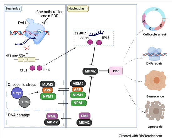 The nucleolar response to different types of stress. Chemotherapies and n-DDR inhibit Pol I transcription and ribosome biogenesis. Free ribosomal proteins, RPL11 and PRL5 then shuttle into nucleoplasm and together with 5S rRNA, they sequester the E3 ligase Mdm2 leading to p53 stabilization. Oncogenic stress also results in the activation of p53 via inhibiting Mdm2. Oncogene such as c-MYC and H-RAS lead to the induction of ARF levels, which together with NPM1 bind and inhibit Mdm2 to activate p53. NPM1 can also interact and inhibit Mdm2 independent of ARF. In response to DNA damage, the PML was also shown to sequester Mdm2 in the nucleolus leading to p53 stabilization. Overall, activation of p53 leads to various responses including cell cycle arrest, DNA repair, senescence, and apoptosis.