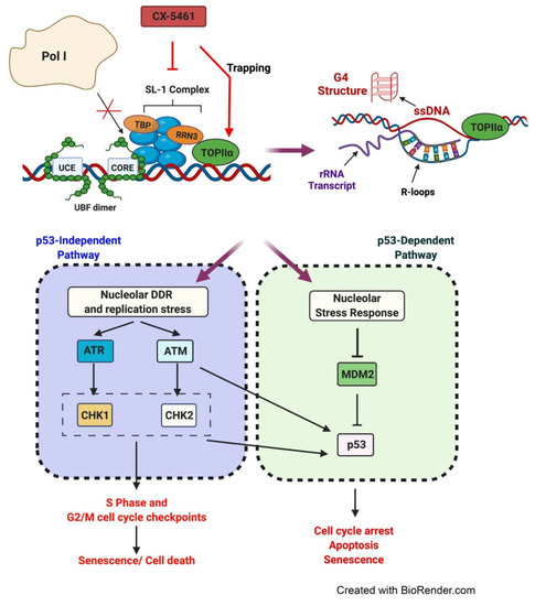 Insight into the p53-independent effects of CX-5461 was demonstrated in BJ telomerase reverse transcriptase (TERT)-immortalized human fibroblasts expressing a short hairpin RNA targeting p53, where CX-5461 exhibited both p53-dependent and -independent growth inhibitory effects in the absence of global DNA damage [88]. In addition to inhibiting rRNA synthesis, CX-5461 was shown to induce perturbations in rDNA chromatin structure by displacing Pol I from rDNA promoters, thus resulting in the presence of “exposed” rDNA repeats devoid of Pol I (Figure 6). This alteration in rDNA topology was found to trigger non-canonical activation of ATM/ATR kinase signaling within the nucleoli in the absence of detectable γH2AX foci [88], a marker of DSBs, and to promote cell proliferation defects as well as inducing senescence.