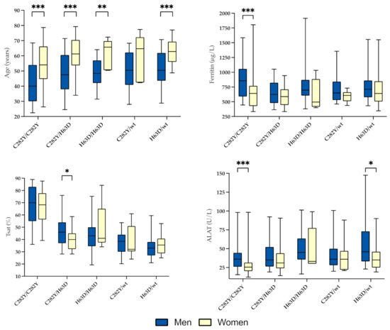 Genotypic differences in age, ferritin, transferrin saturation (Tsat) and alanine aminotransferase (ALAT) levels by gender. Boxes represent the 25th and 75th percentile and whiskers represent the 5th and 95th percentile. Significant p-values are indicated in figures with asterisks: * ≤0.05; ** ≤0.01; *** ≤0.001.