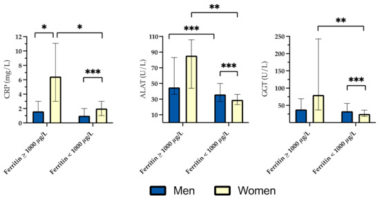 Median C-reactive protein (CRP), alanine aminotransferase (ALAT) and gamma-glutamyl transferase (GGT) in subjects with and without significantly elevated ferritin. Bars represent interquartile range. Significant p-values are indicated in figures with asterisks: * ≤0.05; ** ≤0.01; *** ≤0.001.