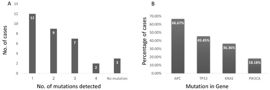 In the tissue samples, coverage analysis of gene panel showed uniformity of 96.88 ± 4.70% and 99th percentile of samples in duplicates had 99.53 reads. One to four mutations were detected in 30 out of 33 (90.90%) cases (Figure 1A). APC was the most commonly mutated gene, present in 22 (66.67%) followed by TP53 in 15 (45.45%), KRAS in 12 (36.36%) and PIK3CA in 6 (18.18%) (Figure 1B).