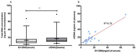 EV-DNA and cfDNA were extracted from EV obtained from the serum and plasma, respectively, of 28 cases of colon carcinoma. Two cases with hemolyzed serum and plasma samples were excluded from the study. The total concentration of EV-DNA ranged from 2.69 to 67.32 ng/mL (median = 10.59 and mean ± SD = 13.19 ± 12.03 ng/mL of serum). The total concentration of cfDNA obtained from plasma ranged from 4.49 to 77.98 ng/mL of plasma (median = 12.89 and mean ± SD = 16.97 ± 14.10 ng/mL of plasma). The cfDNA obtained from plasma was significantly higher than EV-DNA (p value = 0.002; Figure 2A). We found a significant correlation between the concentrations of EV-DNA and cfDNA (R2 = 0.76, p value < 0.001; Figure 2B). The mean and median concentration of both EV-DNA and cfDNA was higher in late-stage (III and IV) compared to that in early-stage (I and II) disease. The difference was statistically significant in EV-DNA (median = 7.99 ng/mL versus 17.16 ng/mL; p value = 0.02, Mann–Whitney test) but not in cfDNA (median = 12.89 ng/mL versus 13.85 ng/mL; p value = 0.94, Mann–Whitney test). No correlation between the size of tumors and concentration of DNA in both EV and plasma was noted (R2 = 0.013).