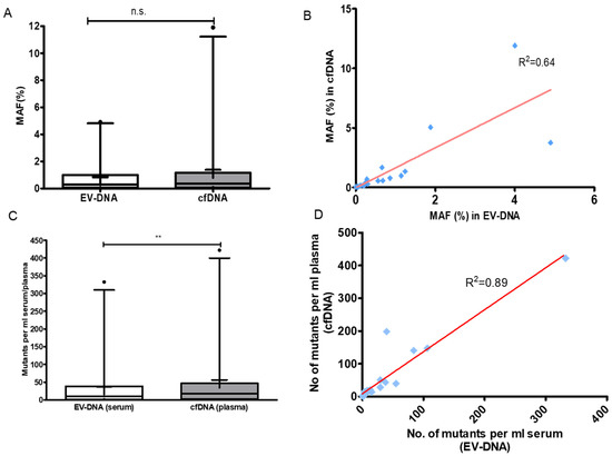Comparison of mutant allele frequency (MAF) and mutant per mL serum/plasma in EV-DNA vs. cfDNA. (A) Box plot to show the comparison of MAF in EV-DNA and cfDNA. No significant difference was found between them (p value = 0.316; Wilcoxon matched pairs signed test, n.s.—not significant). Whiskers represent 5th and 95th percentile and mean shown by + in box plot. (B) Scatter plot shows correlation between MAF in EV-DNA and cfDNA (p value < 0.001, R2 = coefficient of determination, blue squares represent MAF in EV-DNA and cfDNA). (C) Box plot shows that the number of copies of mutants were more in cfDNA than in EV-DNA (p value = 0.003; Wilcoxon matched pairs signed test, Whiskers represent 5th and 95th percentile and mean shown by + in box plot). (D) Scatter plot shows correlation between number of copies of mutants in cfDNA and EV-DNA (p value < 0.001, R2 = coefficient of determination, blue squares represent mutants per mL serum/plasma). ** refers to p ≤ 0.01.