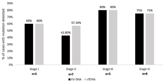 In this study, we identified mutation in 50% and 58.33% of cases, respectively, in EV-DNA and cfDNA in early-stage (I and II) disease and 77.77% of cases in both EV-DNA and cfDNA in late-stage (III and IV) disease. The sensitivity of mutation detection was similar to previously reported studies [2,23]. There was a trend towards increased mutation detection in late-stage (III and IV) disease, compared to early-stage (I and II) disease, in both EV-DNA and cfDNA. However, the difference was not statistically significant, probably due to the small cohort size, as well as because only four cases with metastasis were included in the study. A higher frequency of mutation detection had been earlier reported in large-sized and advanced tumors [23,24]. We also found a significant increase in the frequency of mutation detection when the diameter of tumor was ≥4 cm in both EV-DNA and cfDNA.