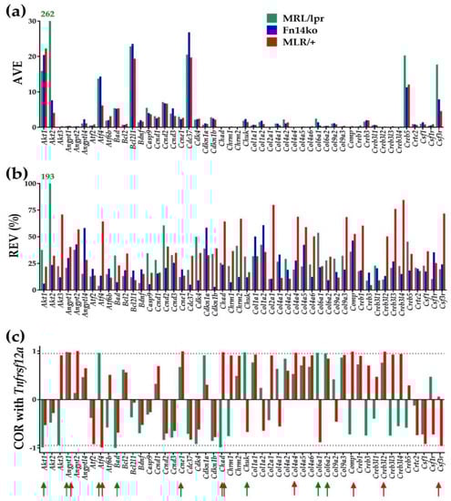 The independent characteristics of the first 50 alphabetically ordered hippocampal PI3K-AKT genes in the three phenotypes. (a) Average expression level (AVE); (b) Relative expression variability (REV); (c) Pair-wise product-momentum correlation coefficient (COR) of PI3K-AKT genes with Tnfrsf12a. Red/green arrows indicate the statistically significant (p < 0.05) correlations in the MRL/lpr and MRL/+ mice. With AVE = 262 and REV = 193, Akt2 is the most remarkable gene of the selection in the hippocampus of the MRL/lpr mice.