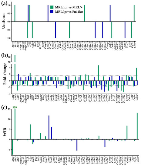 Measures of differential expression of the first 50 alphabetically ordered hippocampal PI3K-AKT genes in the MRL/lpr mouse with respect to the two controls. (a) Uniform contribution (+1 or −1) of the significantly regulated genes. (b) Fold-change (negative for down-regulation) of all genes within the selection. (c) Weighted Individual (gene) Regulation (WIR). In addition to the net fold-change, WIR considers also the reference expression level of the gene and the statistical confidence (1 − p-value) of its regulation. Taken together, it is a comprehensive measure of the relative contribution of the gene to the model’s transcriptome.