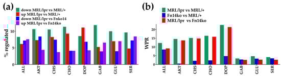 Figure 3a presents the percentages of up- and down-regulated genes within several relevant pathways, including PI3K-AKT (AKT), chemokine-signaling (CHS), and neurotransmission pathways. Figure 3b illustrates the weighted pathway regulation (WPR) scores of these pathways when comparing the three phenotypes. Notably, while there are no distinguishable differences between the models in the GABAergic (GAB), glutamatergic (GLU), and serotonergic (SER) pathways; the PI3K-AKT and chemokine-signaling, as well as the cholinergic (CHO) and dopaminergic (DOP) neurotransmission pathways are differentially regulated in the MRL/lpr mice compared with Fn14ko and MRL/+ controls. The low WPRs, when the 2 controls are compared with each other (Figure 3b; blue bars), indicate similar overall regulation of these pathways in the 2 control phenotypes; thus, pointing to a TWEAK/Fn14-mediated effect on those pathways that are differentially regulated.