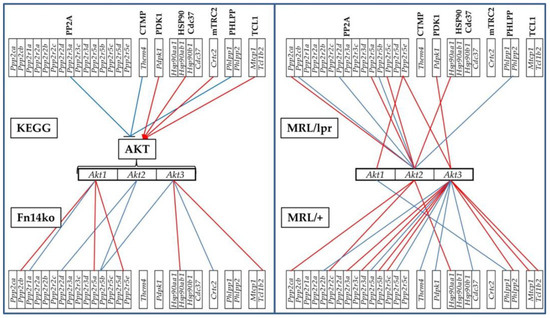 As demonstrated in Figure 2c and Table 2, Akt2 is among the most impactful genes within the PI3K-AKT pathway by an order of magnitude compared with other genes’ WIR. At the same time, as shown in Table 2, other genes also seem to play significant roles in regulating the genomic fabric of the different mice phenotypes through TWEAK/Fn14 activation (highlighted genes in Table 2 show similar effect of up- or down-regulation in both Fn14ko and MRL/+ controls compared with MRL/lpr indicating a likely role for the TWEAK/Fn14 pathway in these gene’s regulation). Of those, the most notable are Dnajc28, Syne2 (synaptic nuclear envelope 2) that are upregulated in the MRL/lpr model compared with both Fn14ko and MRL/+, as well as transthyretin (Ttr) that is downregulated in the lupus-prone mice compared with both controls. All three of these genes have been previously implicated in either CNS pathology [34,35,38,39,40,41,42] or autoimmunity [43], making them interesting targets of further study within the context of NPSLE.