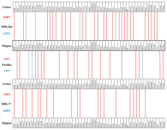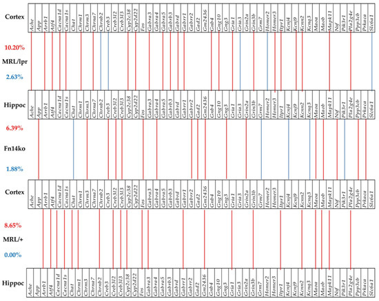 Cognitive dysfunction in NPSLE has been frequently associated with hippocampal functional changes [21,22,23,24,25,26]. Previously, we presented data of gene expression analysis in the cortex of MRL/lpr, Fn14ko, and MRL/+ mice [20]. Figure 5 and Figure 6 illustrate the correlation between gene expression in the cortex, compared with the hippocampus of the 3 phenotypes, in the PI3K/AKT and neurotransmission pathways, respectively. These figures focus on the genes that are significantly expressed in-phase (expression levels are in the same direction, either enhanced or suppressed) and antiphase (gene expression is in opposite directions) among the two brain regions of each phenotype. As shown, there is enhanced in-phase gene expression between the regions in the MRL/lpr phenotype in about 10% of the analyzed genes in both pathways. However, the pattern of this association, both in the extent of general in-phase expression and which genes are synchronously expressed is phenotype-specific. Furthermore, when focusing on the asynchronously expressed genes between the 2 regions (blue lines), it is interesting that the lupus-prone MRL/lpr mice show the most asynchronous expression of genes in both analyzed pathways, while the MRL/+ controls show none.
