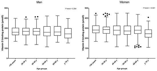 Among women, the VDBP concentration was found to decrease dramatically with age (p trend < 0.001), but this trend was not observed in men (p trend = 0.264) (Figure 1).