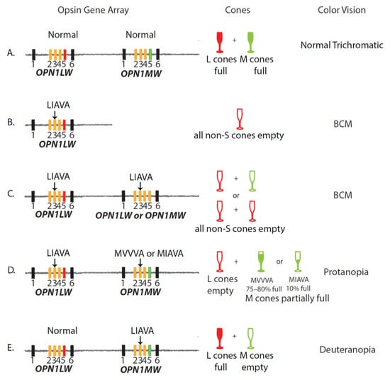 - Buena-Atienza, E.; Ruther, K.; Baumann, B.; Bergholz, R.; Birch, D.; De Baere, E.; Dollfus, H.; Greally, M.T.; Gustavsson, P.; Hamel, C.P.; et al. De novo intrachromosomal gene conversion from OPN1MW to OPN1LW in the male germline results in Blue Cone Monochromacy. Sci. Rep. 2016, 6, 28253. [Google Scholar] [CrossRef]
