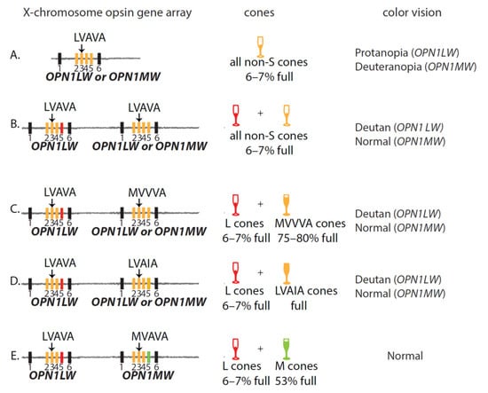 - Winderickx, J.; Battisti, L.; Motulsky, A.G.; Deeb, S.S. Selective expression of human X chromosome-linked green opsin genes. Proc. Natl. Acad. Sci. USA 1992, 89, 9710–9714. [Google Scholar] [CrossRef]