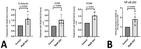 To better understand the underlying direct pathogenic effects of accumulating Gb3 on inflammatory mechanisms, we used an in vitro cell culture approach using human umbilical vein endothelial cells (HUVEC) stimulated with Gb3 to simulate processes occurring in the vasculature in a Fabry patient. We were able to confirm a proinflammatory effect of Gb3 on endothelial cells, as the inflammation-related endothelial proteins E-selectin, ICAM, and VCAM were significantly upregulated at the mRNA level after 4 h of Gb3 treatment (Figure 2A). We confirmed this proinflammatory property of Gb3 by measuring the translocation of the NF-kB signaling component p50 into the nucleus after one hour of Gb3 treatment. Indeed, Gb3 significantly increased p50 protein in the nucleus of endothelial cells (Figure 2B).