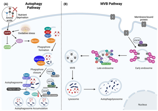 The ESCRT pathway is also highly conserved from yeast to humans and is essential for a number of diverse cellular processes including multivesicular body (MVB) biogenesis and sorting of ubiquitinated membrane proteins into intralumenal vesicles (ILVs) (Figure 1B), viral budding, cytokinesis, transcription and cell cycle control [7,11,30,31]. The ESCRT pathway is grouped into four categories: ESCRT-0, which regulates MVB biogenesis; ESCRT-I, which is also responsible for MVB biogenesis and for sorting ubiquitinated cargo into MVBs; ESCRT-II, which is responsible for assisting ESCRT-I in MVB biogenesis; and finally, ESCRT-III, which functions in cellular abscission and contributes to viral budding when cells are infected [30,31,32,33,34]. Furthermore, the ESCRT machinery is also required for autophagosome-lysosome fusion and the consequent degradation of sequestered cytosolic contents [7]. However, the dysregulation of ESCRT leads to the accumulation of damaged cellular organelles, such as mitochondria [7]. Inactivation of ESCRT machinery results in metabolic stress, a mechanism by which autophagy becomes activated [11].