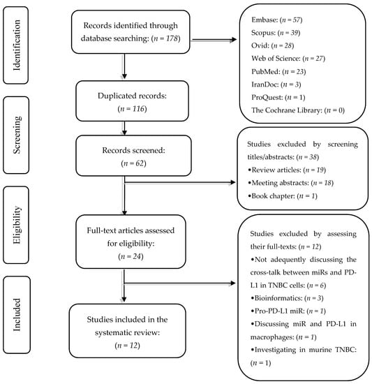 For the current systematic review, we included the studies that met the following inclusion criteria: (1) peer-reviewed original papers published in English or Persain, (2) studies investigating miR restoration on PD-L1 expression in TNBC cells. Based on the following criteria, these studies were excluded from the current systematic review: (1) studied that failed to fulfill the above-mentioned criteria, (2) studies that investigated the effect of a pro-PD-L1 miR, (3) studies that investigated the cross-talk between studied miR restoration and PD-L1 expression in other cells residing in the tumor microenvironment, rather TNBC cells, (4) studies that their data were solely based on bioinformatics, and (5) studies that investigated the effect of miR restoration on PD-L1 in non-human TNBC cells.