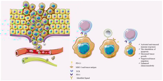 Single-cell sequencing-guided biomimetic-based miR-delivery. After identifying the tumoral antigen based on single-cell sequencing data and fabricating related receptor/CAR/TCR on the biomimetic carriers, the delivery of the PD-L1-inhibiting miRs can substantially stimulate anti-tumoral immune responses, activate apoptosis of tumoral cells, inhibit tumor proliferation, suppress tumor migration, and enhance the chemosensitivity of tumoral cells to chemotherapeutic agents. Objects are obtained from https://smart.servier.com/ (accessed on 25 July 2021).