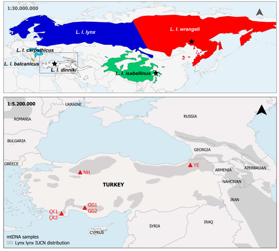 Top: Map of Eurasian lynx subspecies distribution. Stars indicate source area of mitogenomes added to the dataset in [18] (this study; [38,47]). Bottom: Map of Turkey depicting the locations of the four sampling sites for L. l. dinniki in Turkey. These sites are the Çığlıkara Forest Reserve (ÇK) and the Gidengelmez Mountains (GG) in Southwest Anatolia, the Nallıhan Mountains (NH) in Northwest Anatolia, and the Yusufeli-Kaçkar Mountains (YE) in the Lesser Caucasus. Shaded areas indicate the distribution of Lynx lynx [5].