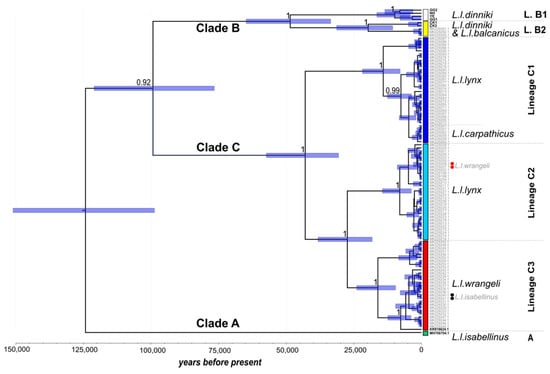 Bayesian phylogenetic tree of L. lynx mitogenome sequences. Posterior node support is given for all nodes with values >0.9. Blue bars at nodes indicate the 95% credibility intervals for coalescence times in years (x-axis). The three main branches are labeled according to clade assignment; lineage and subspecies assignment is indicated on the right. Vertical colored bars mark lineages, which are separated by dashed horizontal lines. Sequences are labeled by either GenBank accession number [18,38,47] or by location (L. l. dinniki). Red dots mark two L. l. wrangeli individuals within lineage C2 (see text for explanation); black dots indicate the two erroneously labeled L. l. isabellinus individuals in lineage C3.