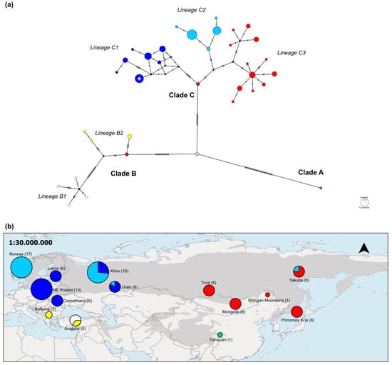Relationships among L. lynx mitogenomes and their geographic distribution. (a) Median-joining network of L. lynx mitogenome haplotypes. Each circle represents a haplotype, with the circle size indicating the number of individuals sharing that haplotype. Black dots (vectors) were introduced by the network constructing algorithm and represent haplotypes not sampled. Dashes along lines that connect haplotypes indicate the number of nucleotide differences between haplotypes. Coloring of lineages follows Figure 2. Diamond-shaped symbols indicate the most recent common ancestors (MRCA), white: MRCA of all clades, red: MRCA for lineages. The white star in lineage C1 indicates the L. l. carpathicus-specific haplotype. (b) Geographic distribution of L. lynx mitogenomes across the Palearctic region. Coloring of circles follows Figure 2 and indicates clade/lineage assignment, circle size indicates number of individuals included. The figure was adapted from Lucena-Perez et al. [18] and extended to include L. l. dinniki (Anatolia, n = 6), L. l. wrangeli from China (Khingan Mountains, n = 1 [47]), and L. l. isabellinus (Tianquan, n = 1 [38]).