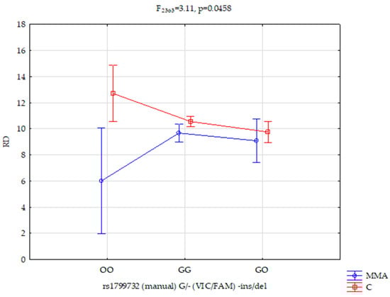 The results of a 2 × 3 factorial ANOVA of the MMA and control subjects were found for reward dependence (F1363 = 10.53, p = 0.0013, η2 = 0.028; Table 5). The analysis had a 90% power to detect in the MMA and control subjects the effects of the studied reward dependence and the interaction (about 3% of the phenotype variance). We found a statistically significant effect of a complex factor of the DRD2 rs1799732 genotype on reward dependence in both groups (F2363 = 3.11, p = 0.0458, η2 = 0.017; Table 5 and Figure 1). The analysis had a more than 59% power to detect the complex factor of MMA/control x DRD2 rs1799732 and their interaction effect they exert (about 2% of the phenotype variance).
