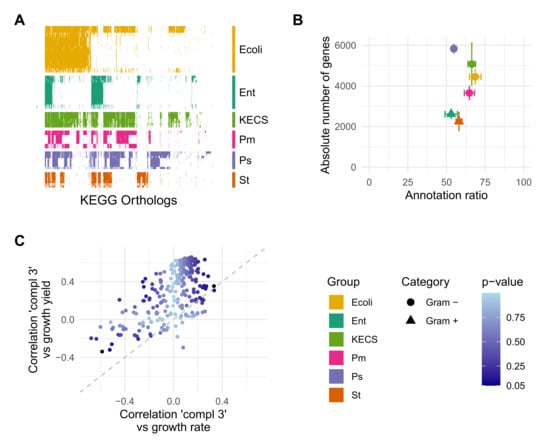 (A) Heatmap of presence (coloured) or absence (white) of KEGG Orthologs in the different bacteria groups. Although most KOs are present in the KECS group, other groups lack many. Note that only the KOs that are present in at least one organism are shown. (B) Although the absolute number of genes in the genome of each group varies per group, their annotation ratio from genome to KOs remains similar around 60%. The groups St and Ent have notoriously less genes and, thus, less absolute number of KOs than the rest of the groups. (C) Comparison of the relation of ‘Complementarity 3’ with the increase in two different growth measures: yield and rate (from [5]). The correlation is higher, for most pathways, when calculated against growth yield. An overview of the relation of all calculated indices with growth rate and yield is presented in Figure S2.