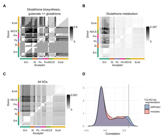 Heatmap of the ‘Correlation 3’ between the different strains within the groups. (A) The KOs selected belong to a module. (B) The KOs represented are part of a pathway. (C) All KOs were taken into account to calculate the ‘Complementarity 3’. (D) The density distribution of the correlations between the ‘Complementarity 3’ calculated using KOs belonging to one pathway at a time is shown in blue. In red, there is the similar calculation for modules. The vertical line represents the correlation using all available KOs. Using the pathways for the segmentation of the KO vectors yields the highest correlations.