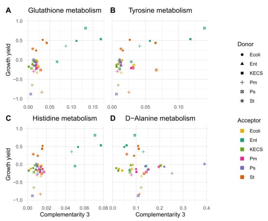 Relation between ‘Complementarity 3’ and growth yield (i.e., increase in the acceptor’s growth yield as seen in [5]). Each dot represents a pair acceptor-donor. This information is described in the right-hand legend. The first two pathways, (A) and (B), belong to the top-rank pathways in Table 1. They show a higher complementarity for the pairs for which the growth yield is higher, and vice versa. (C) represents the Histidine metabolism pathway. It was selected as another pathway of interest, and it shows a similar behaviour. On the other hand, in (D), the pathway D-Alanine metabolism was chosen as a low-rank pathway. In this case, there is no correlation between the complementarity measure and the growth yield increase.