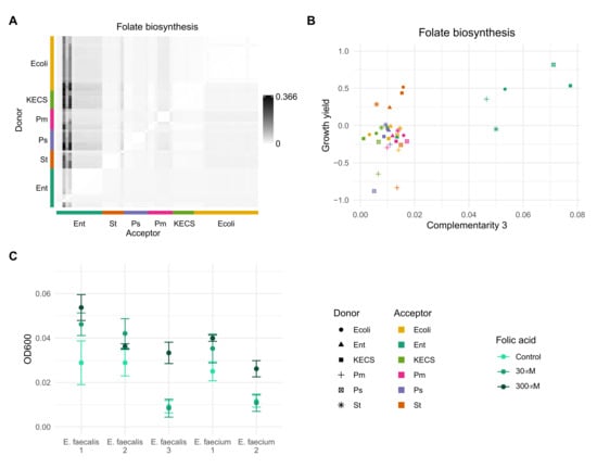 Folate complementarity. (A) Heatmap of Complementarity 3 for the pathway. (B) Enterococci as acceptors have higher complementarity for folate biosynthesis and increased growth yield values. (C) Supplementation of artificial urine medium with folic acid increases the growth yield of different E. faecalis and E. faecium isolates. Statistical significance was assessed with a t-test (p < 0.05), with Bonferroni correction to correct for multiple comparisons. All isolates, except E. faecalis 1, had a significant growth increase for at least one assessed folic acid concentration; E. faecalis 2 (30 M), E. faecalis 3 (300 M), E. faecium 1 (30 M), E. faecium 2 (300 M).