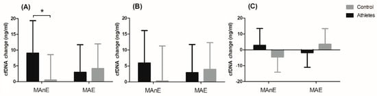 Figure 2A). The results of the post hoc test showed a 94.03% smaller increase in the control group in cfDNA concentration immediately after MAnE compared to the athlete group.