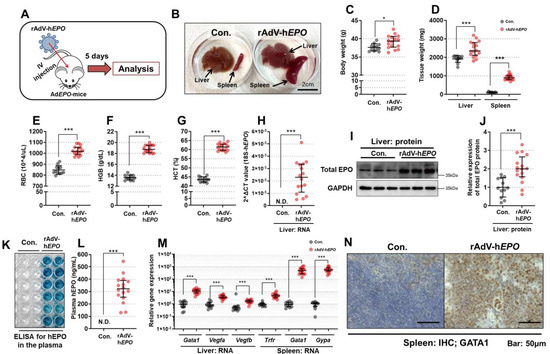 Figure 1A shows an overview of this experiment. A phenotypic analysis performed 5 days after the injection of rAdV-hEPO showed a significant increase in the body weight of AdEPO mice in comparison with the control mice. The livers and spleens of AdEPO mice also showed significant hypertrophy (Figure 1B–D). The RBC counts, Hgb levels, and HCT values, which served as hematological markers in whole blood, were also significantly increased (Figure 1E–H), indicating the occurrence of hematopoiesis.