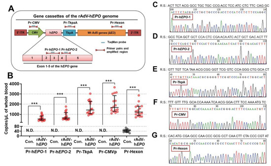 Direct proof in whole-blood DNA from AdEPO mice. (A) Strategy for designing specific primer-probe pairs for the viral genome. “Pr” indicates a primer-probe pair. (B) Detection of direct proof using the TaqMan qPCR assay performed with whole-blood DNA from the control (n = 12) and AdEPO mice (n = 15). (C–G) Sanger sequence analysis of the pooled amplicon on the TaqMan qPCR assay using five primer-probe pairs; R.S. indicates a reference sequence that completely matches the amplicon over 40 nucleotides on any primer-probe pair. N.D.: not detected. *** p < 0.001.