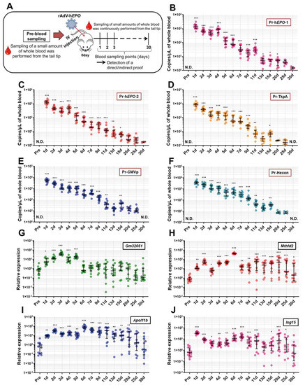 Detection of direct and indirect proof for a long time period. To detect direct and indirect proof, small amounts of whole blood were harvested from the tail tips of mice (n = 12) until 30 days after the injection. From approximately 50 μL of whole blood, DNA/RNA was extracted, and the TaqMan or TB Green qPCR assays were performed to detect direct and indirect proof. (A) Overview of the experiments in this section, (B–F) continuous detection of direct proof for 30 days by five primer-probe pairs using the TaqMan qPCR assay; “Pr” refers to a primer-probe, (G–J): detection of changes in gene expression as indirect proof using the TB Green qPCR assay. N.D.: not detected. * p < 0.05, ** p < 0.01 and *** p < 0.001 vs. pre-value.
