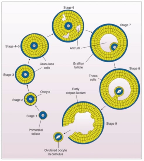 - Matzuk, M.M.; Burns, K.H.; Viveiros, M.M.; Eppig, J.J. Intercellular communication in the mammalian ovary: Oocytes carry the conversation. Science 2002, 296, 2178–2180. [Google Scholar] [CrossRef]